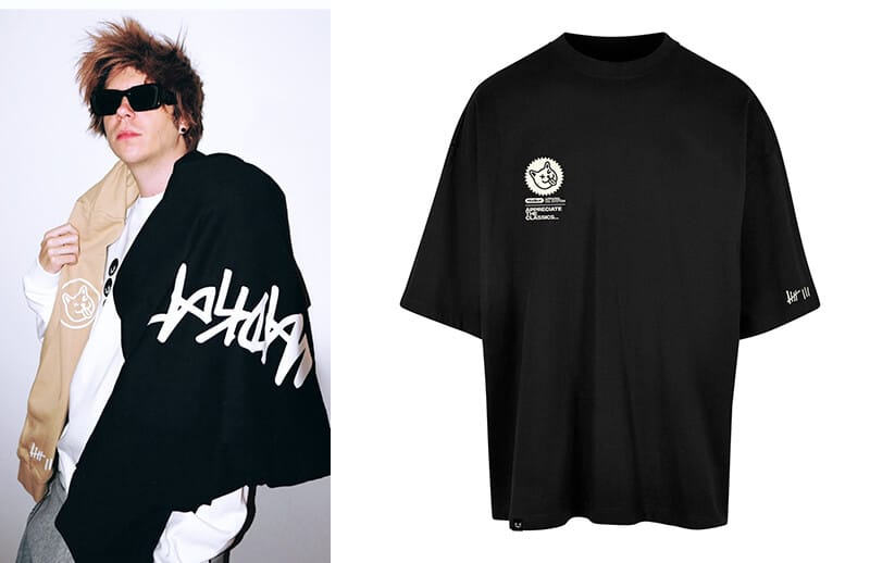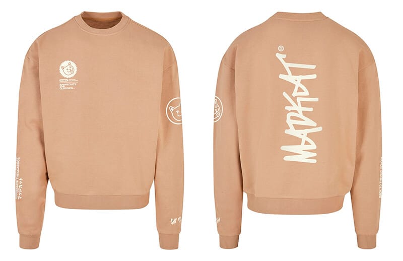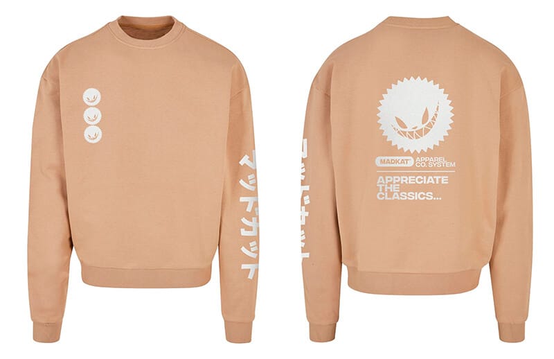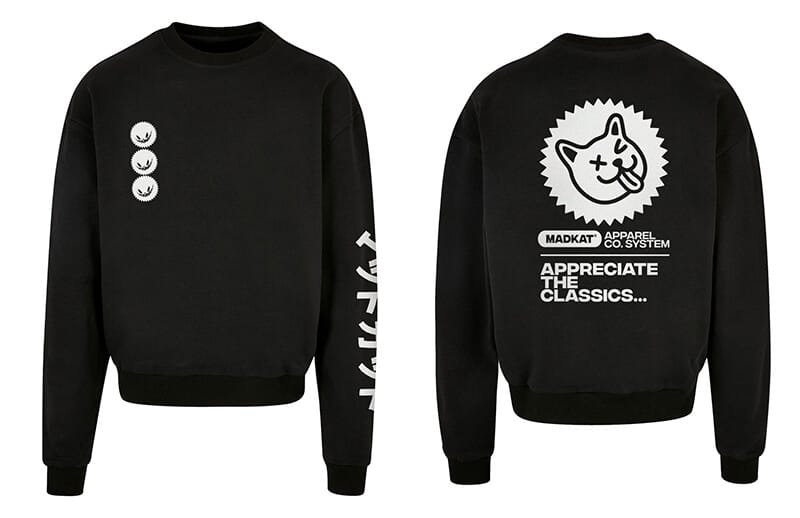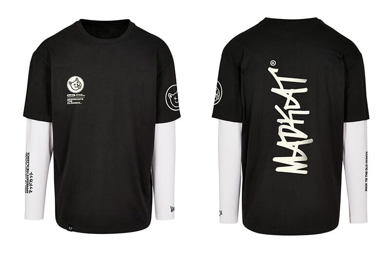 Its design includes the Mad Kat logo repeated three times vertically on the right side of the chest, a phrase in Japanese on the left sleeve and a large design that covers the entire back with the phrase “Appreciate the classics” and more characteristic drawings of the brand, such as a cartoon cat logo.